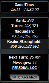 The game is turn-based, with turns occurring every thirty minutes. Upon each turn, you generate a certain amount of in-game currency called Naquadah('Naq'), and 'untrained' units ('UU'). You can use Naquadah for everything from training troops to upgrading technology or buying weapons. You must guard this well, for the more Naquadah you have, the more likely it is that someone will try and attack you to take it!. In turn, though, you can use your turns to attack other players, to get their Naquadah. Untrained units are gained from your Unit Production (UP), generate a small income on their own, and are also trainable into the various unit types in the game (see